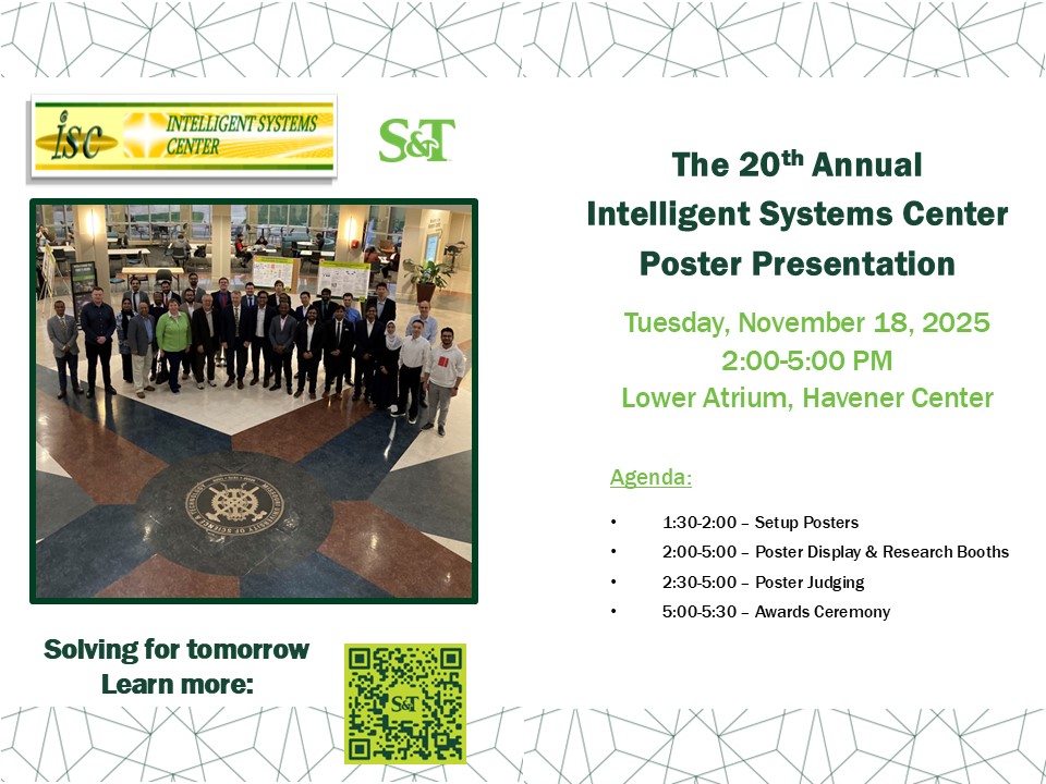 The poster presentation, funded by the Intelligent Systems Center, is held each year to offer students the opportunity to present their research results. In 2024, the guest speaker at the awards ceremony was Dr. Kamal Khayat, vice chancellor for research and innovation.